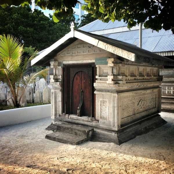 The woodwork, interior, wall panels, and roofs are significant examples of Maldivian lacquer work and woodcarving. A round blue-white adjoining minaret to the mosque looks similar to a wedding cake with its base resembling the funnel of the ship. Beautifully braced with metal strips it is built of coral stones. Carved coral tombstones forming a graveyard surrounds this minaret.